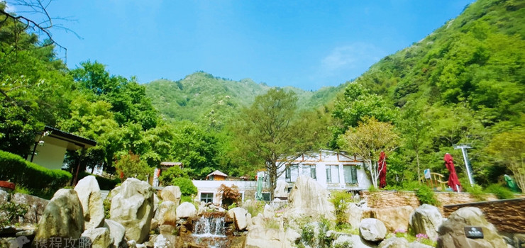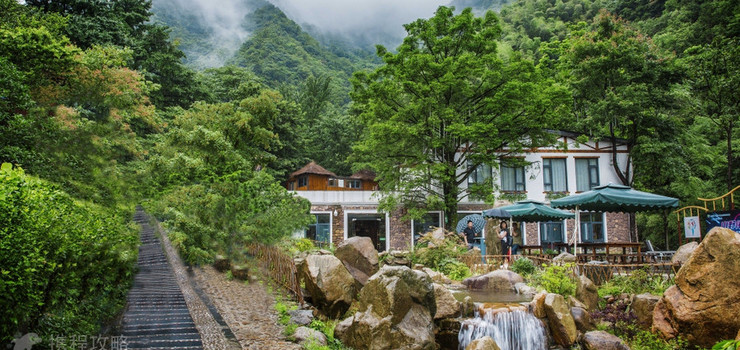 青山绿水间,白墙黑瓦,小桥流水,长廊红灯笼,让你在这片环境中宁静下来,感受建筑融入自然的美。