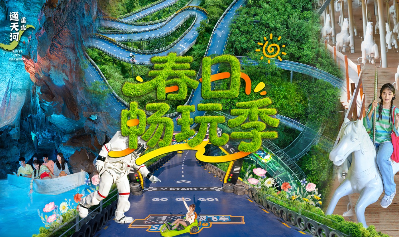 垂云通天河景区(即OMG心跳乐园),位于杭州桐庐境内,是一个隐秘在喀斯特地貌山谷中的综合型主题景区,惊险刺激却老少皆宜。景区以“上天入地”的游乐主题独创三大游乐组团:西游秘境、魔法森林和天空之城,打造成集美景、美食、美好体验为一体的综合型山地主题乐园,上天可玩转空中嘉年华,入地能探险奇幻地下河,孩子们在游玩中认识大自然的神奇,年轻人在嗨玩刺激中解放自我,年长者在山水间找回青春的气息。“惊叫”过的人生,无所畏惧!上天入地,玩的就是心跳!