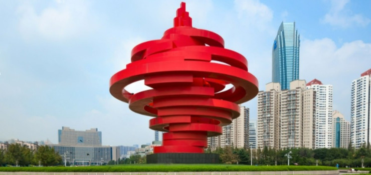 广场主体雕塑《五月的风》高30米,直径27米,采用螺旋向上的钢体结构组合,以单纯洗炼的造型元素排列组合为旋转腾升的“风”之造型,充分体现了五四运动反帝反封建的爱国主义基调和张扬腾升的民族力量。