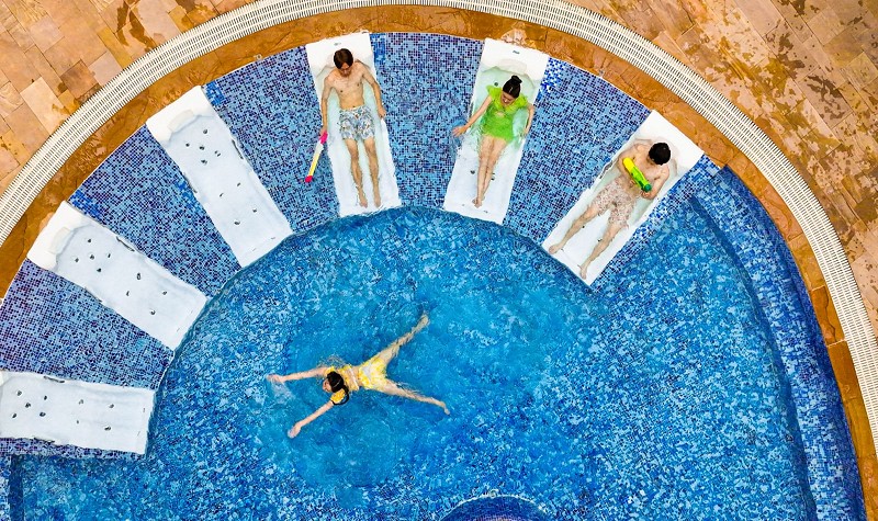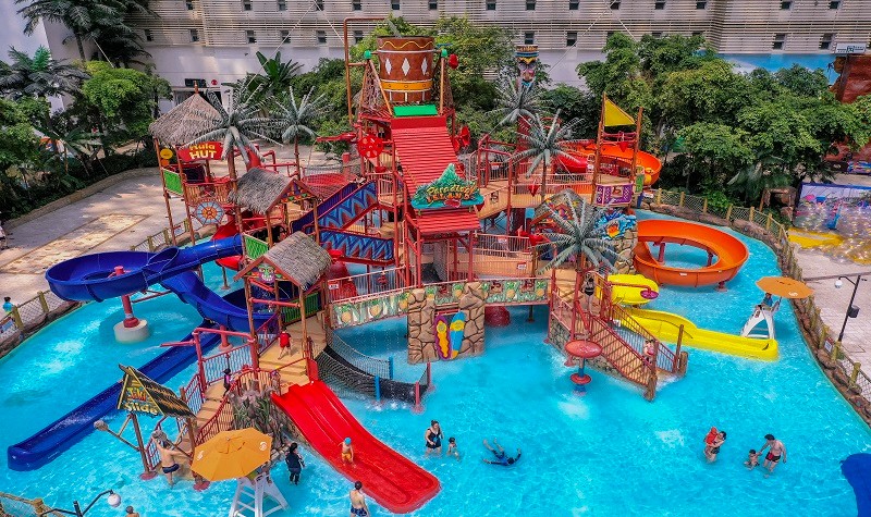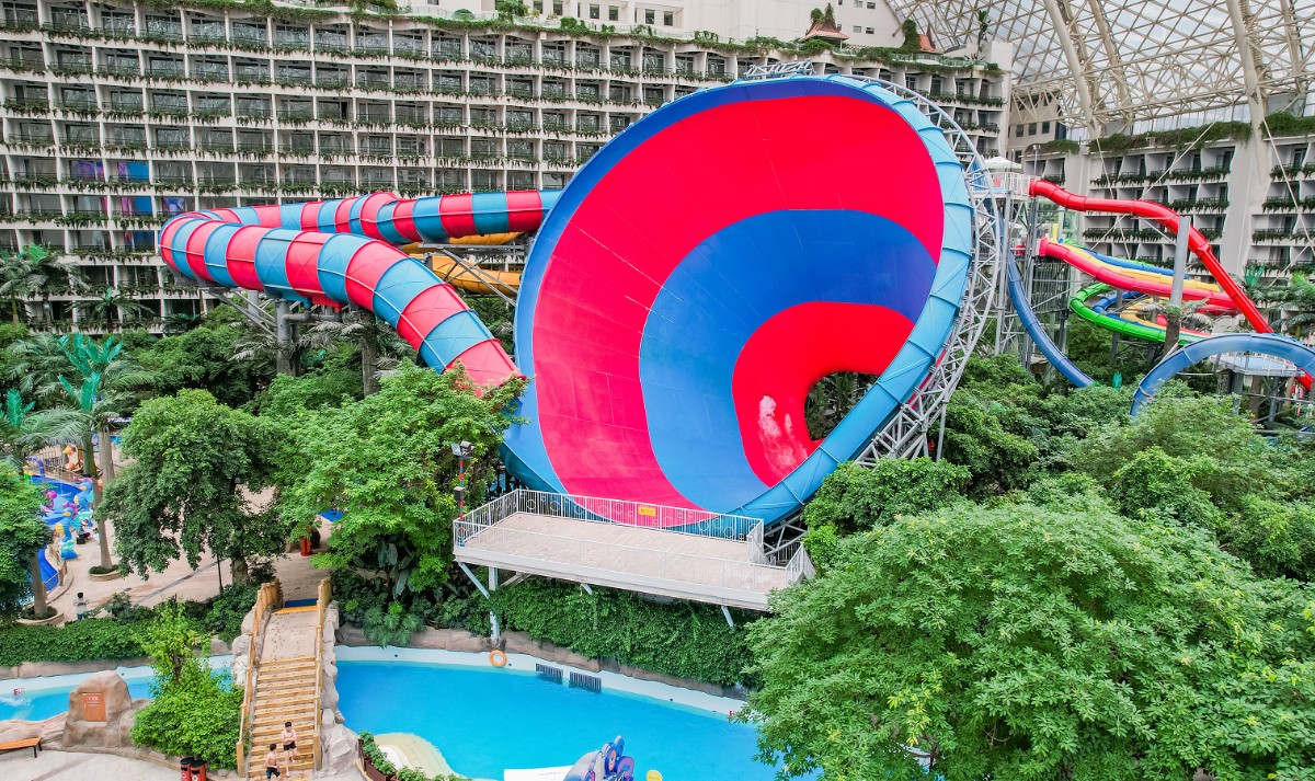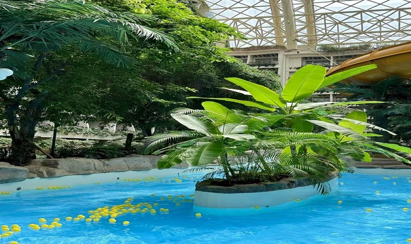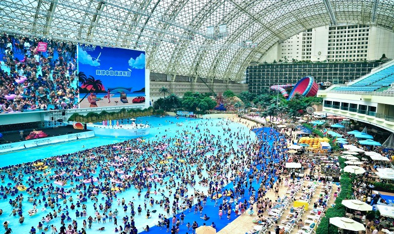 环融环球中心海洋乐园作为成都市地标性建筑环球中心的核心项目,占地约8万平方米,建筑面积25万平方米,由造浪区、游乐区、汤池区、商品美食区组成,可同时容纳近万名游客,是一个高品质的室内水上乐园。