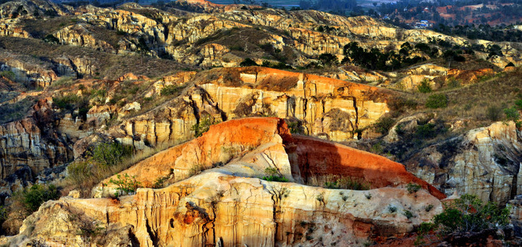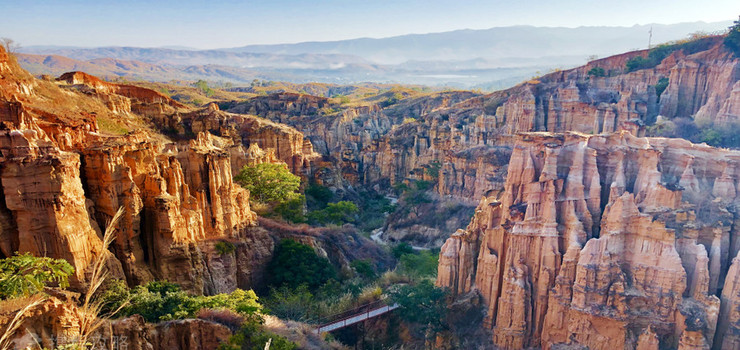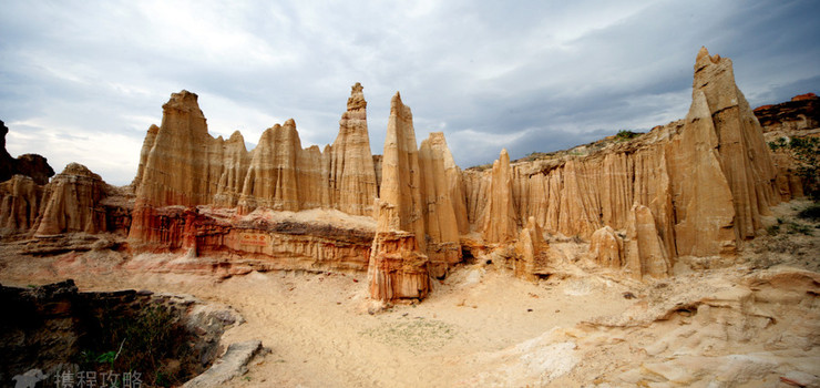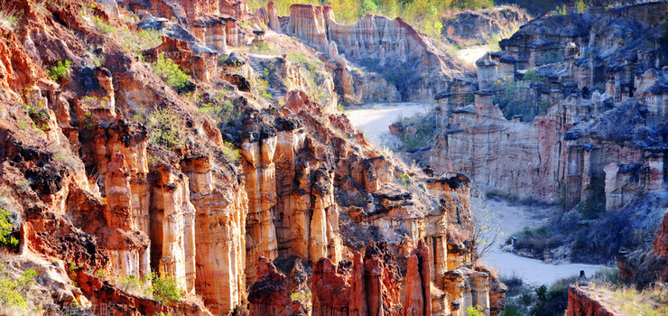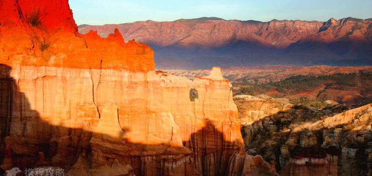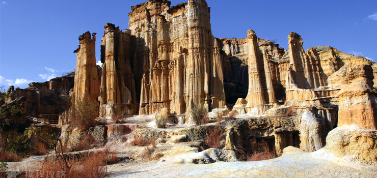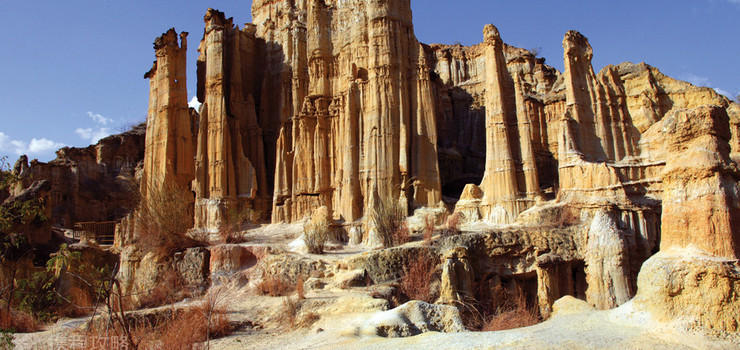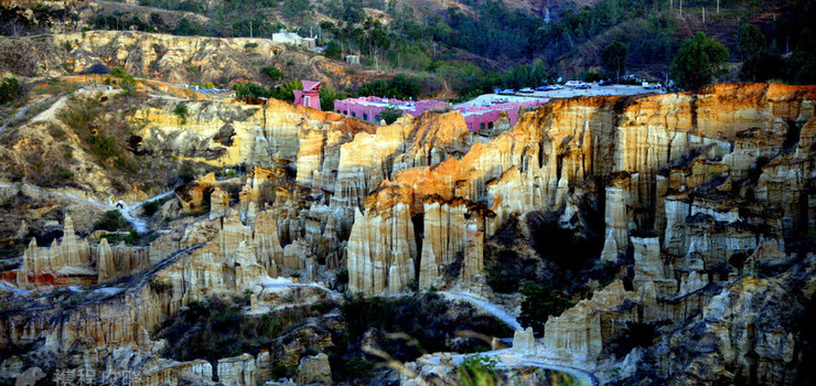 虎跳滩土林位于元谋县城西北32公里的物茂乡虎溪行政村,又称物茂土林,芝麻土林,总面积2.3平方公里。虎跳滩土林形状以城堡状、屏风状、帘状为主,高度一般10-15米,至高27米。从远处眺望虎跳滩土林,沟壑纵横,荒凉粗犷、犹如一座废弃的城堡。而近看则像一组组工程巨大的艺术群雕。