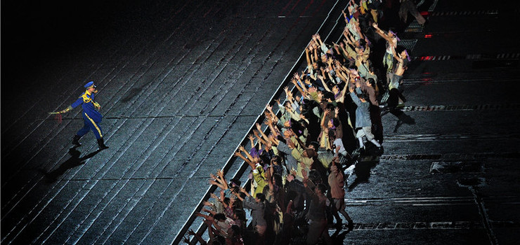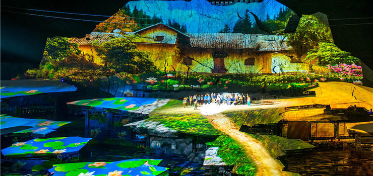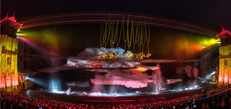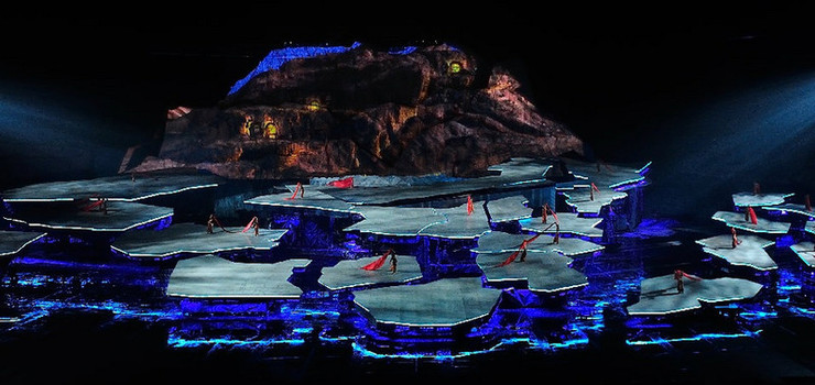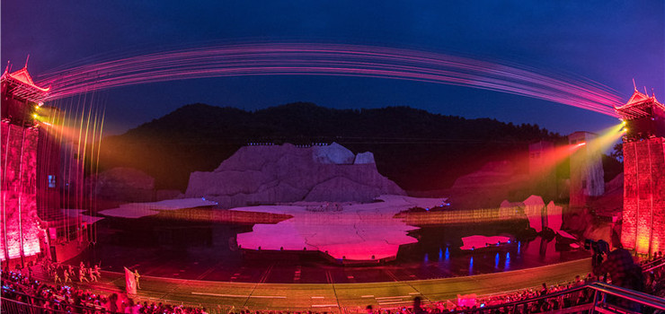 演出中,舞台将包含LED背景屏与地屏,在演出中将根据剧情,呈现不同的影像,描绘出不同历史时期的环境。当舞台板块分开,每一块地屏影像结合背景,又将创造出一个新的舞台时空。影像与舞台的运动向配合,让现场环境不断改变,在不同的历史环境中转换。