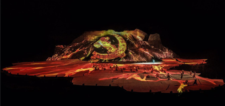 在舞美视觉创意设计中,充分结合现场地形条件、舞台造型和剧情发展,并以预演影片的形式进行形象直观的呈现,缩小的呈现仍然让人能感受到真实表演时的震撼与大气磅礴。