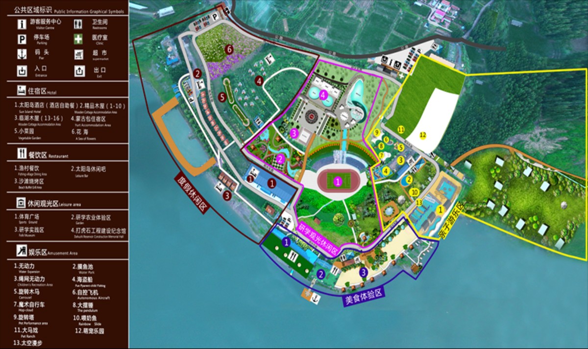 ①水上娱乐区:紫蒙湖水面近9000亩,水体清澈蔚蓝,非常适于水上观光娱乐。北岸太阳岛设有水上游乐区和钓鱼台,游人可在浅滩和规定的深水区域尽情游弋,还可以在备有躺椅,阳伞的钓鱼台尽享垂钓之乐。园区内还备有各种脚踏、碰碰船供游人乘坐和休闲。坐上飞伞,环湖飞天,湖光山色,空中尽览;紫蒙湖水上观光、娱乐项目多多——惊险刺激的、温馨浪漫的、戏水玩水的、江南风情的等应有尽有,快乐无极限。