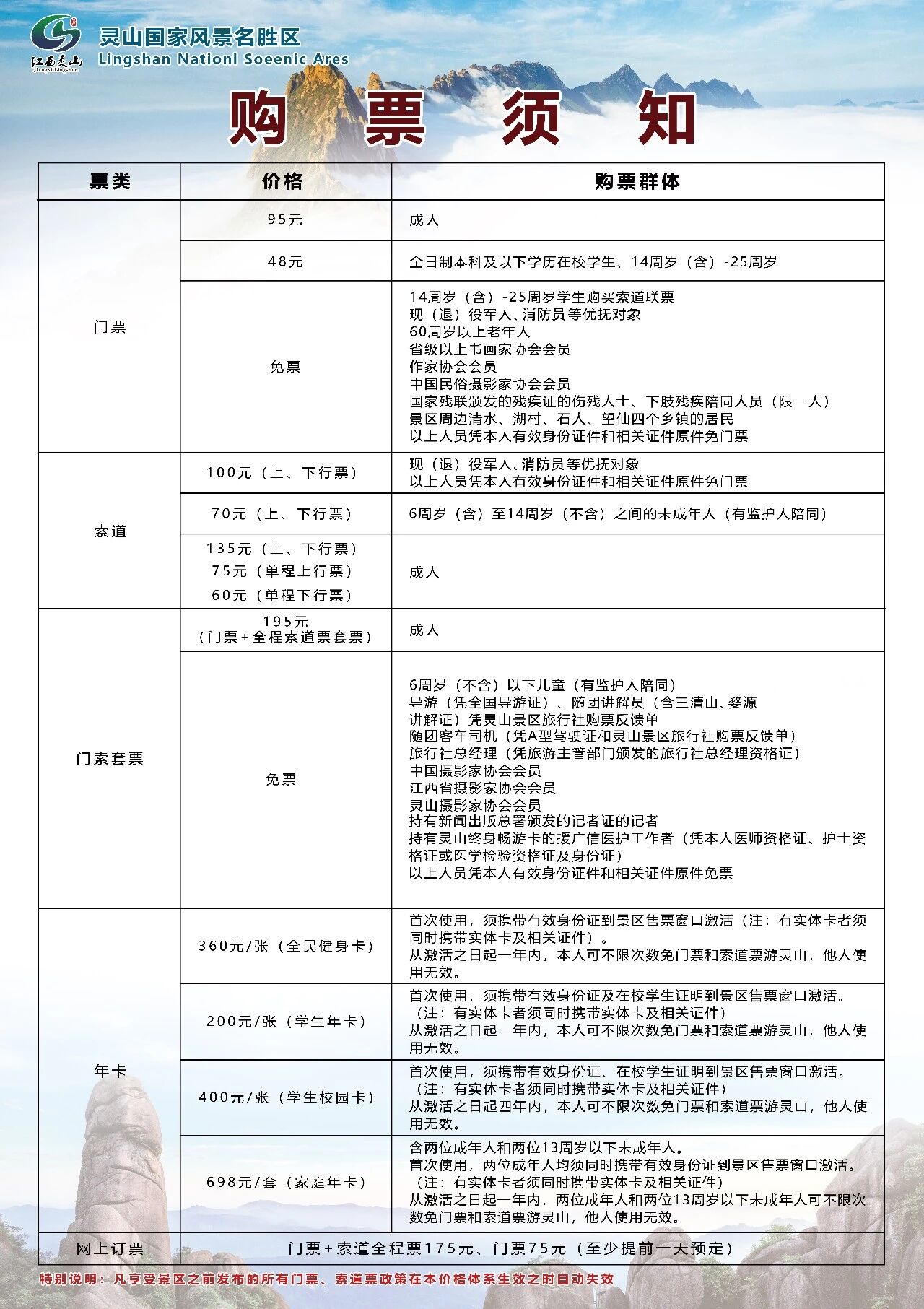 1.以下人员凭本人有效身份证件和相关证件原件免门票索道票:6周岁(不含)以下儿童(有监护人陪同)、导游(凭全国导游证)、随团讲解员(含三清山、婺源讲解证)凭灵山景区旅行社购票反馈单、随团客车司机(凭A型驾驶证和灵山景区旅行社购票反馈单)、旅行社总经理(凭旅游主管部门颁发的旅行社总经理资格证)、中国摄影家协会会员、江西省摄影家协会会员、灵山摄影家协会会员、持有新闻出版总署颁发的记者证的记者、持有灵山终身畅游卡的援广信医护工作者(凭本人医师资格证、护士资格证或医学检验资格证及身份证)。