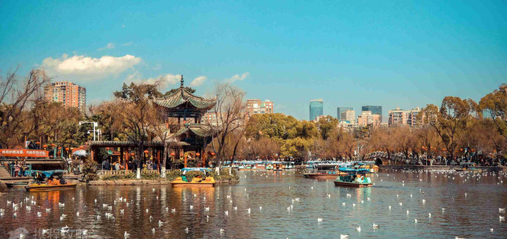 翠湖公园到每年冬天就有成千上万只北方飞来的红嘴鸥在翠湖越冬,嬉闹戏水,争抢食饵,给翠湖增添了无限的情趣。这是由于昆明四季温暖如春,适合海鸥过冬,加之昆明人视鸥如友,爱护海鸥,昆明市政府也规定不准捕捉海鸥,不准放爆竹惊吓海鸥。 这样,红嘴鸥与昆明人结下了"朋友"之情,每年11月份,它们就飞来昆明过冬,第二年3-4月,它们又离开昆明飞往我国东北及西伯利亚等地。每当这时,逛翠湖赏海鸥便会成为昆明人以及许多外地游客的一大乐趣。冬春时节,上万只红嘴鸥云集翠湖,成千上万的人投食喂鸥,成为春城一大景观。