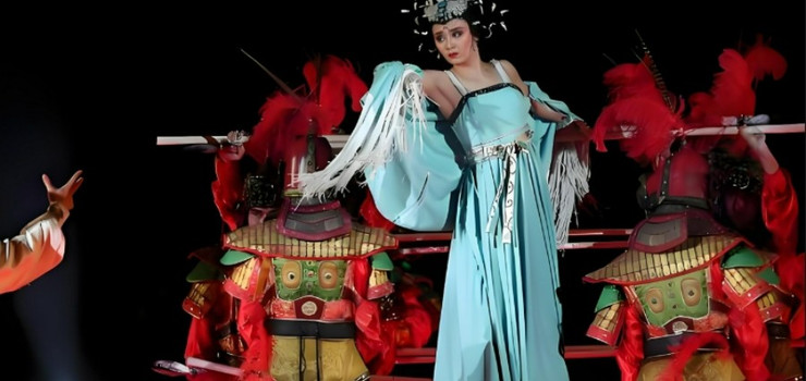 唐明皇携杨贵妃仓惶西逃至马嵬坡,护军将士哗变,逼迫唐明皇赐死杨贵妃。贵妃无助孤单,明皇难分难舍,无情的白绫绕在贵妃身上,在惨淡的月光下贵妃凄美地死去。苍凉、凄楚的歌声在空旷的山野里久久回荡……