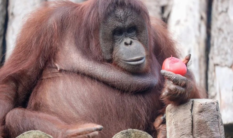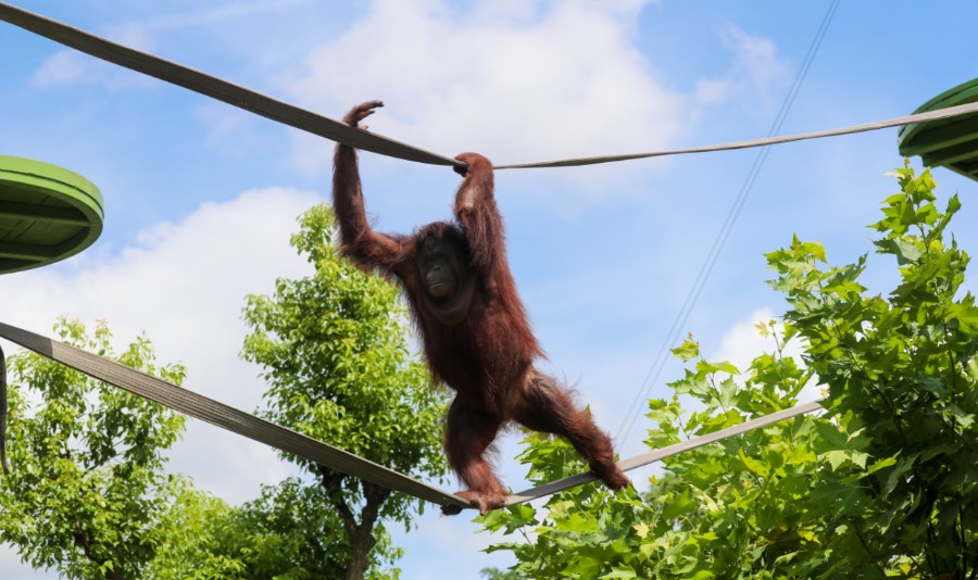 在上海野生动物园的红毛猩猩家族里,四毛是公认的“全能女王”。这位2003年出生的雌性红毛猩猩魅力非凡,是位“大美猩”,凭借古灵精怪的性格和自带的“江湖气息”,圈粉无数,正所谓不会吃的“时尚猩”不是好运动健将!作为“老吃家”,四毛的“微胖”体型,那可是实打实的“干饭成果”。仿佛对美食有着刻进DNA的执念,保育员刚拿着食物露面,四毛准是第一个凑上去的,夏日限定的莲子,百吃不厌的瓜子,还有日常的果蔬,没有它不爱吃的。也正因这份对吃的热爱,四毛比好姐妹五毛胖了一大圈,圆滚滚的身子憨态可掬。吃饱喝足的四毛,还是位专业“营业猩”,会对着保育员和游客秀出各种互动小动作:飞吻、举手、抱抱,甚至还会模仿人类鼓掌、比心,这些可爱的动作不仅是对保育员情感的传递,也是红毛猩猩高智商的表现。虽然是只“胖猩”,却丝毫没影响四毛的灵活身手,依旧是家族里的“运动健将”。四毛和壮壮是园区创新推出的“猩空漫步”行为展示项目的重要主角。数米长的高空索道上,四毛能凭借天生的身体优势,手脚并用在索道上从容穿梭,动作灵活自如。不过这位“运动健将”偶尔也会偷点懒,仗着壮壮对自己的谦让,常常把高空展示的“主场”让给壮壮,自己则悠哉地