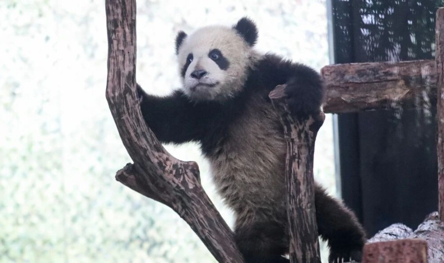 芊然、芊逸展出近半个月以来,保育员每天都会细心记录它们的体重、呼吸、食欲和活动状态,特别关注它们面对新环境与众多陌生面孔时的适应情况。令人欣慰又好笑的是这两个小家伙,好像天生就自带社牛属性!在它们眼里,朝夕相处的保育员早就是自己人了。每天除了吃睡玩,两小只还多了一项乐趣:一见保育员经过,就迈着小内八步追上去,抱腿的抱腿、蹭蹭的蹭蹭,恨不得挂在他们身上撒娇,俨然一副你来了就陪陪我嘛的赖皮样。而面对玻璃外熙熙攘攘的陌生游客,两小只的表现可谓镇定自若。不管展厅里来了多少人,它们依旧该爬栖架爬栖架、该打闹打闹,困了就躺平睡觉,甚至当众“撒野”也一脸坦然,主打一个随心随性、自在为王。偶尔玩到兴起,它们还会踱到玻璃边,抬起圆脑袋瞅瞅大家,乌溜溜的眼睛里写满了清澈的好奇,仿佛在说:“嘿,你们也是来看我的吗?那你们可看对啦!”成长,就是在安全感里勇敢做自己。半年来,从依赖妈妈到亲近保育员,从熟悉内场到淡定面对人群,两小只用行动告诉我们:真正的适应,不是改变自己,而是在足够的安全感里,坦然保持自己的节奏。