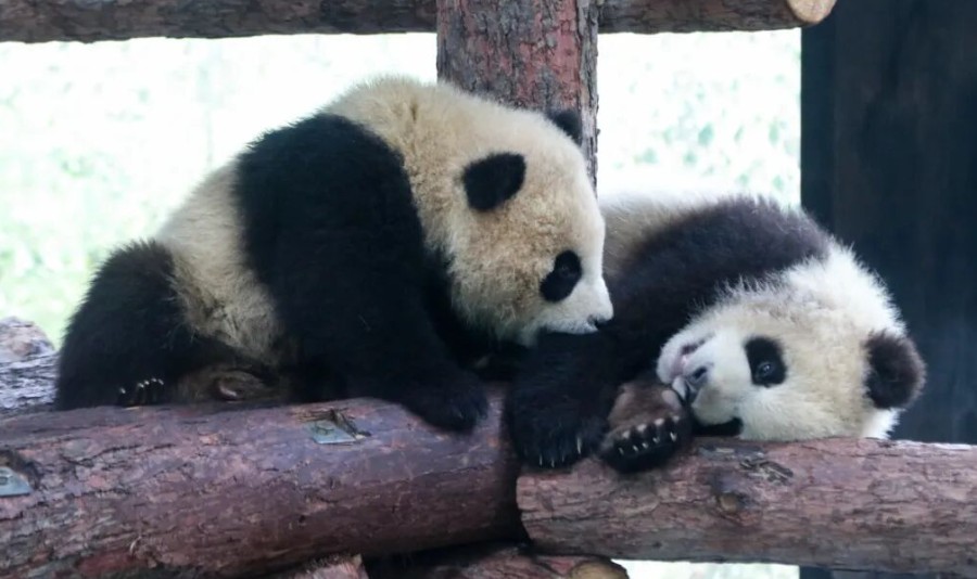 户外探索告一段落,两小只就会回到室内,和芊金妈妈开启温馨的亲子互动模式。首先是来自妈妈的“轮番宠爱”。芊金妈妈会用自己的方式“宠爱”两个小家伙,用鼻子蹭蹭这个,用爪子拍拍那个,一会儿咬着后脖颈“教育”孩子,一会儿抱到怀里亲昵地舔舐。别看姐弟俩才7个月,牙齿已经开始痒痒了!它们会抱着妈妈的竹笋、竹子使劲啃,把妈妈的“美食”当成磨牙棒,啃了半天也只是在竹子上留下几道浅浅的牙印,仅受了点“皮外伤”。精力充沛的两小只还喜欢互相打闹。你拍我一掌,我推你一下,翻滚、扑咬、摔跤……场面一度“混乱”,但大家都看得出来——这不就是两只毛茸茸的小团子在撒娇嘛~追着保育员跑更是它们的“保留节目”,尤其是姐姐芊然,特别喜欢扒拉员工通道门,好奇心超强,总想看看门后面有什么秘密。玩累了怎么办?当然是秒变“乖宝宝”!两小只会乖乖地依偎在妈妈身边,找个舒服的姿势,很快就进入梦乡,小嘴巴还时不时动一下,大概是在梦里也想着好吃的吧~