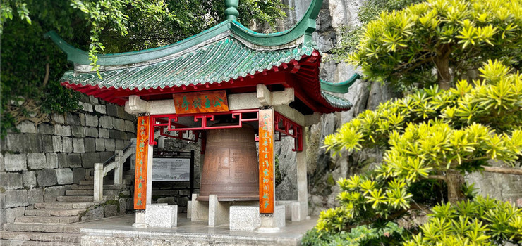 位于伏波山南麓,还珠洞南口西侧,为单层翘檐攒尖顶4角方亭。高4.7米、,宽4.5米。长4.4米,面积19.8平方米。因亭中存放古钟而得名。钟亭方正古朴,与文物协调和谐。古铁钟高2.5米,径1.7米,重2524公斤,铸造于清康熙八年(1669),用以宣扬孔有德封藩建旗之功。钟顶部有《多心经》一卷;四周各栏用“皇图巩固”、“帝道遐昌”、“佛日增辉”、“法轮常转”作铭文的引首;钟体为“本旗功德主金名”,实则是当年军事头目的名录,以宗教掩盖政治目的。这口钟,过去作为寺门的法器,成了历史发展的见证。