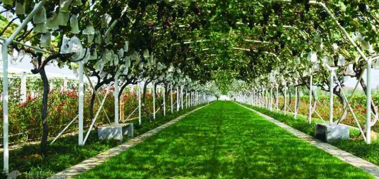 葡萄公园背依浩瀚大海,与金沙滩相伴,风光迤逦。上千亩葡萄园里种植了180多种来自世界各地的名贵葡萄, 500米鲜食葡萄长廊秀美壮观。迎宾台、沧浪小溪、醴泉湖,勾勒出一幅自然和谐的画卷