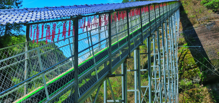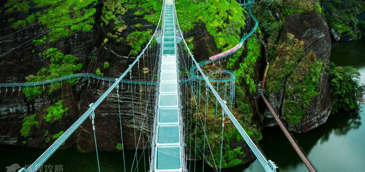 天王桥,横跨于九镜湖上,全长110米,桥宽3米,距离水面20余米,桥身可承重85吨。行走时,可听万马奔腾之声,有如天王驾到,千军来袭,气势磅礴,故此得名。