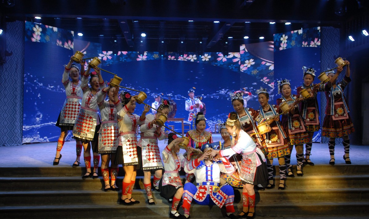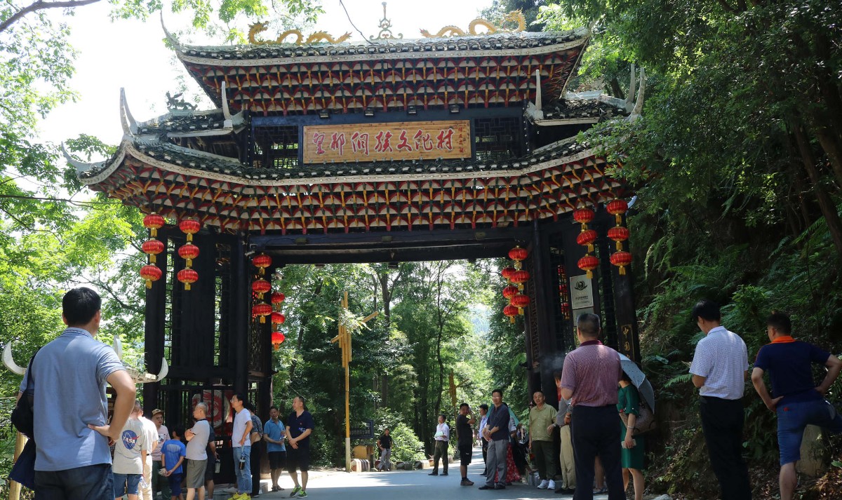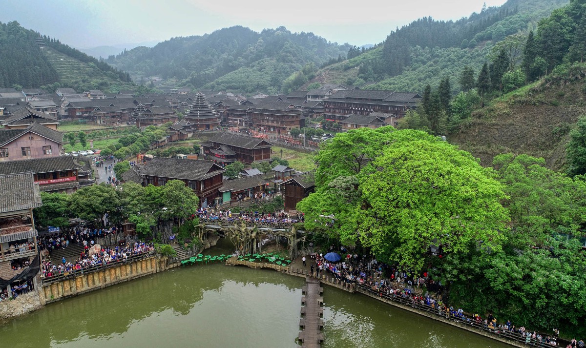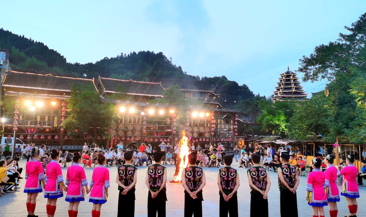 建筑包括寨门、戏台、鼓楼、风雨桥、凉亭等,网红特色摔碗酒,皇都不倒翁,五彩风车街等