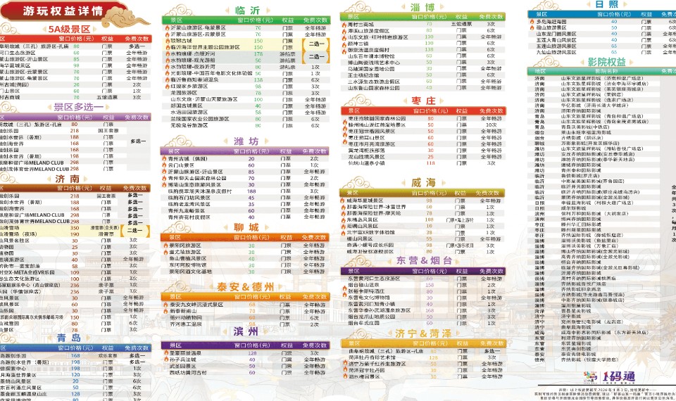“好客山东一码通”是由山东文旅集团山东文旅云智能科技有限公司建设、运营的全省文旅电子年卡权益类会员产品,旨在立足文旅市场,满足游客日益的增 长文旅消费需求,降低游客出行门槛,实现“一码在手 畅游山东”“好客山东一码通”整合全省约百家景区及影院等本地生活类文旅资源,打通预约码、验证码等数据系统,构建文化旅游生活生态联盟,打造一码通订、一码通验、一码通行的便民、利民、惠民的智慧文旅畅行系统,塑造文旅消费新场景、新模式,用户购买后可享超万元文旅权益。