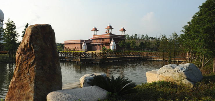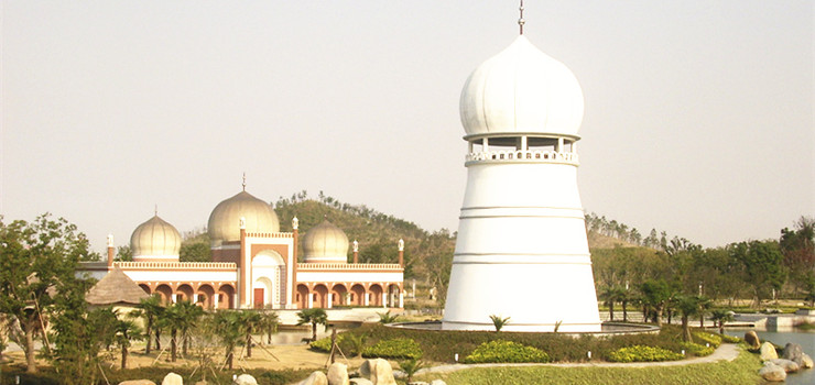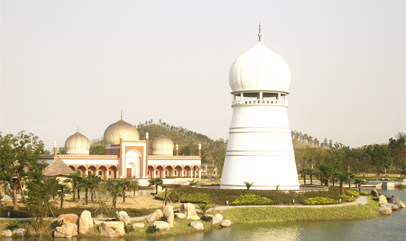异域风情区建筑面积为3300平方米,设计师们选择郑和船队故事性较强的7个国家(古里、锡兰、忽噜莫斯、麦加和麻林等)和地区标志性建筑。