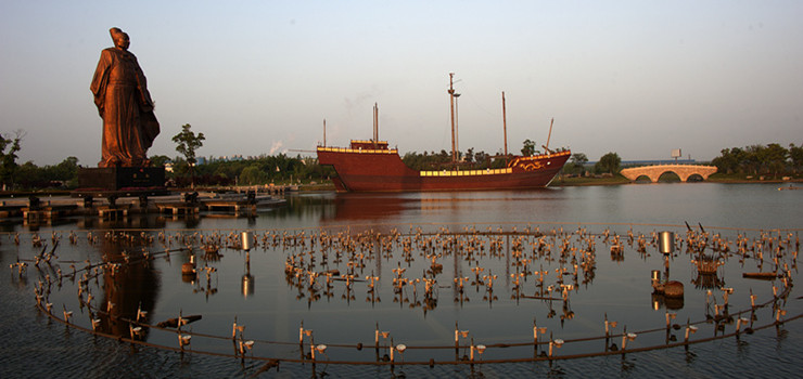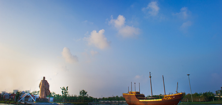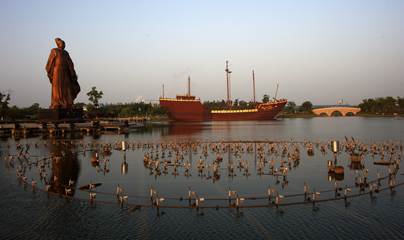 郑和手执航海图,昂首挺立在长江口当年七下西洋的起锚地,高大而典雅,宏伟而凝重。