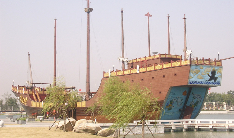 这艘宝船长71.1米,宽14.05米,这是为了纪念1405年7月11日郑和在太仓首航出海的日子。船尾部有三层,近18米高,高的桅杆达38米,寓意郑和曾经去过的三十八个国家和地区。整个宝船颜色为朱红,雕刻的颜色为金色,颇有皇家气派。站在宝船上,可以俯看景观广场的景色和音乐喷泉表演。