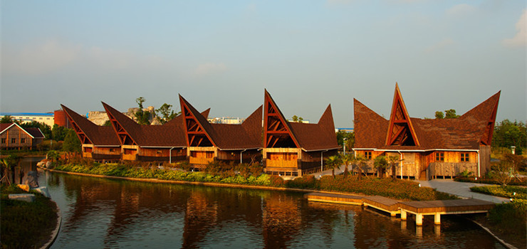 它以塔桥为界,桥西狭长地带建造民居,以木色为主色调,屋顶用浅褐色瓦,局部用草顶;桥东建造宫廷建筑,以偏红偏蓝偏黄的暖色调为主,屋顶选择层次感强、色彩好的油毡瓦。