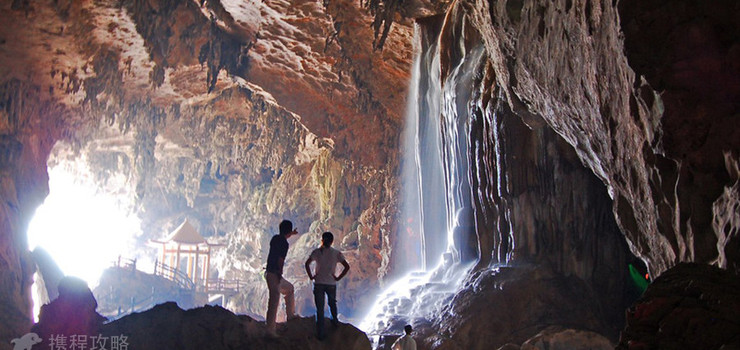 从来没有想到过,原来瀑布也可以在洞中观看。在盘古洞天中,就有这样的一个天然的瀑布穿洞而下,一年四季水流不绝,给人一种超出意外的惊喜。不过洞中的水源从何而来,似乎没有人知道。据当地相传,这个瀑布乃是仙女在仙女浴室里洗澡时遮羞用的金幕。仙女走时忘了带走,而后化成瀑布。