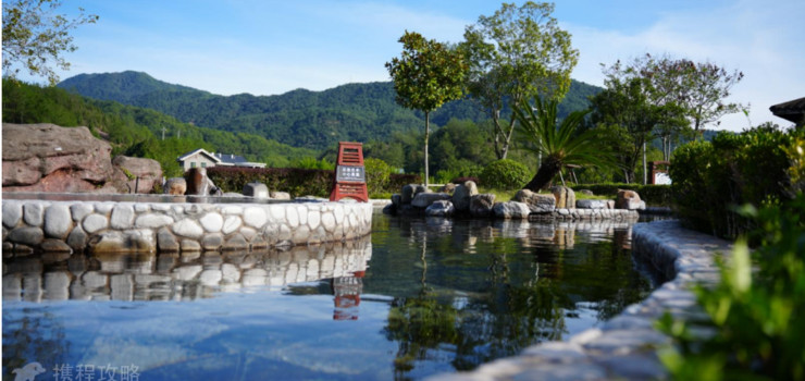 园区亭台楼阁、青砖灰瓦、飞檐翘首、雕龙画栋,彰显浓郁客家文化风情。在这里,泡汤已化身为提升心灵的养生艺术:浴佛池的花瓣闻尽花之香;石板温泉更是享受温热云石的舒体之效。在这里,可以吃温泉蛋,甚至享受私密温泉的乐趣。