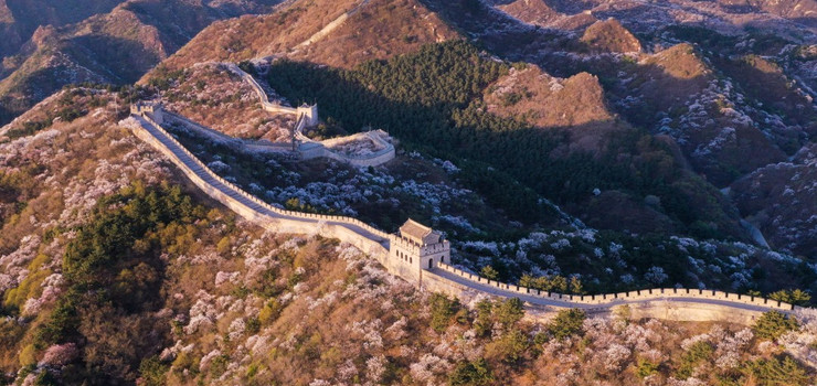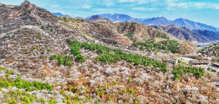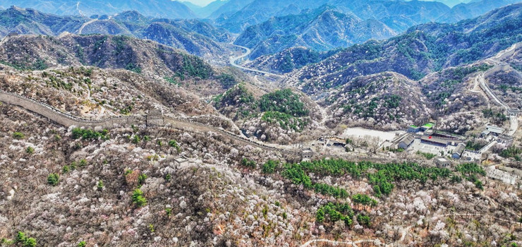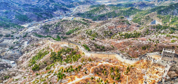 春天的八达岭长城一片生机勃勃,沧桑与新生并存。“杏花坡”每临春季花团锦簇。