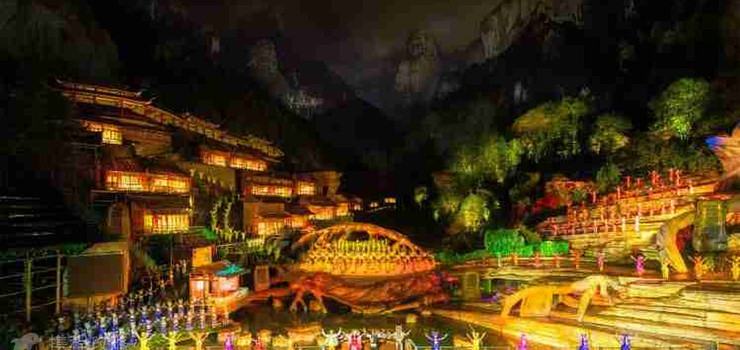 天门狐仙是一部震撼的山水实景演出、魔幻音乐剧。故事改编自神话传说《刘海砍樵》,讲述了一段感天动地的人狐之恋。剧中真实展现了东方玄幻风格的场景:一个半足球场大小的剧院漫天飞雪、狐狸精在舞台上直接变幻成人型、较大可移动人造月亮、瞬间被流水包裹的5000平米玻璃钢炫彩舞台、60米长高空飞桥、主人公飞升至上百米高空变换成星星消失……高科技为你呈现的视觉盛宴。