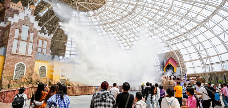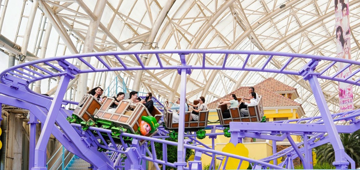 室内激流勇进组合,激流勇进的高处达30米,位于山体内部,乘船逆流而上达高点,猛然间,载着20名游客的船会自高处飞驰而下,疾驰声、尖叫声、激起的水声一起来袭,游客回过神看到水中激起的巨幕水帘,不禁感叹激流勇进的巨大威力与魅力。