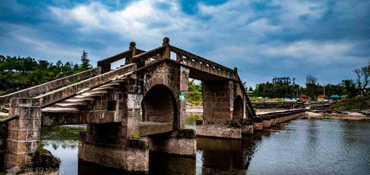 大荣桥建于明朝正德初年,为石质平板桥,桥面由平整的大青石铺就,每块约重10吨,全长116米,宽1.75米,共有24跨,连接万灵东西两岸。中央桥礅上曾有龙头龙尾石雕,文革中被破坏。现存大荣桥几经修复,依旧保持原貌,为重庆市市级保护文物。