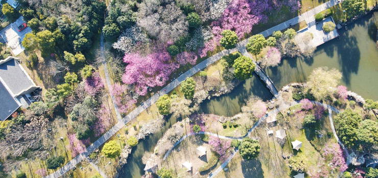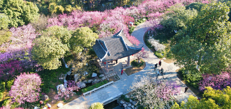 超山位于塘栖镇区内,以梅而闻名天下,与无锡梅园、苏州邓尉并列为近现代三大观梅胜地。从宋代咸亨年间何熹之的《重修福臻寺并增建钟鼓二楼记》的碑记中,可以看到超山的梵刹始于唐代之后的五代后晋时期(936—946),距今有一千多年的历史了,超山植梅的历史也始于此。主峰超山,海拔260米,因超然突立于皋亭,黄鹤之外故名。