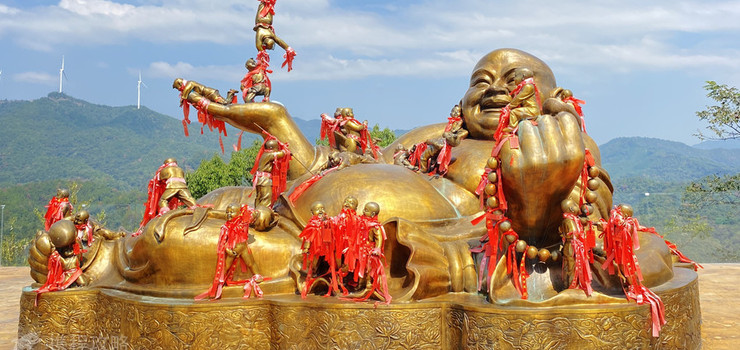 “童子戏弥勒”整座佛像长达6.5米,高2.8米,宽4米,由巨型铸铜打造。底座为雕花设计,只见斜倚而卧和弥勒左手紧握佛珠,笑容可掬,双耳垂肩。在弥勒硕在的身体上,塑有整整30个正在嬉戏耍闹的小顽童,各个形神各异,栩栩如生。孩童通过叠罗汉,拔河,撒尿,拿树枝捅弥勒的肚脐等手段来达到戏弄佛陀的目的,弥勒大佛终究也不为所支,依旧其乐无穷,体现弥勒包容一切之海量,正可谓“笑天下可笑之人,容天下难容之事”。来到童子戏弥勒一定要摸佛童接福运,1、摸佛肚:宽容大度;2、摸童子:早生贵子;3、摸童膝:顶天立地;4、摸佛足:足智多摸,代表聪明智慧、脚踏实地、精进不止;5、摸童肩:平安健康6、摸童脑:无忧无虑;7、摸童肚:福运;8、摸财童:财运;9、摸童手:活泼开朗、礼貌懂事;10、拍童屁:聪明懂事、乖巧听话;11、摸童腿:代表志向高远;12、摸童背:代表积级向上,挑战自我、勇往直前;13、摸童脑:和和气气;14、摸童脑:团团圆圆;15、摸童手:幸福美满;16、拜童子戏弥勒:顺心如意!