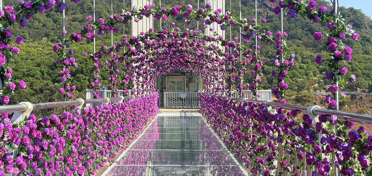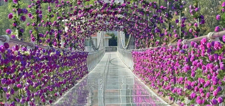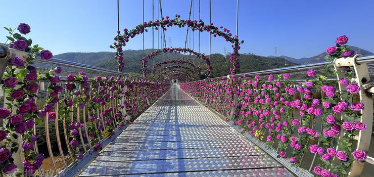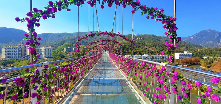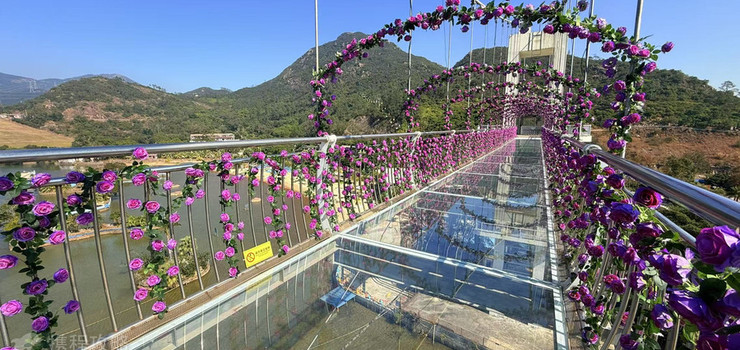 古兜财神玻璃桥位于古兜温泉小镇山泉水世界内,全长200米,桥高50米。桥面悬空300米。玻璃桥经过幻影触碰技术玻璃特效刺激,在同一桥面观赏山海湖泉绝美风光,把古兜温泉小镇的繁华全景尽收眼底。