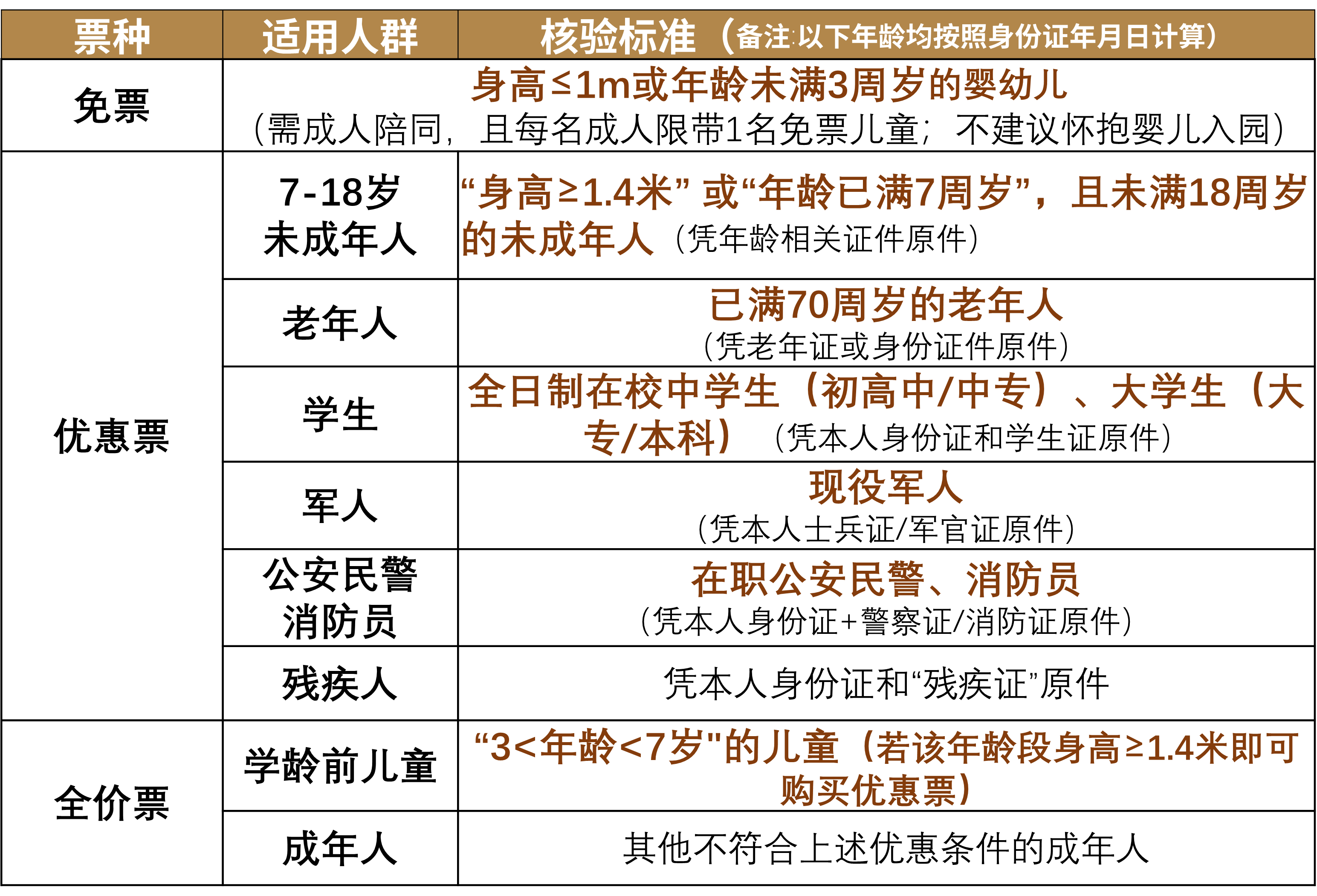 ①儿童:未满3周岁(须凭证件,按照身份证年月日算)或身高≤1m的幼儿需成人陪同,且每名成人限带1名免票儿童。不建议怀抱婴儿入园