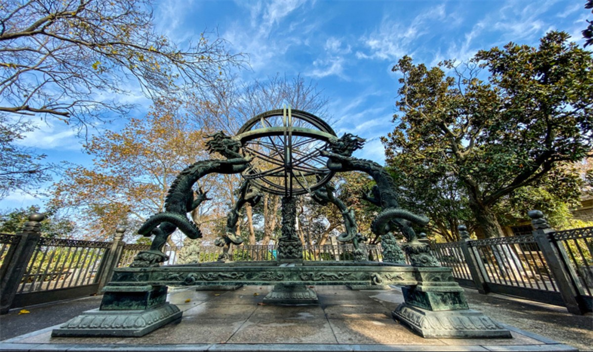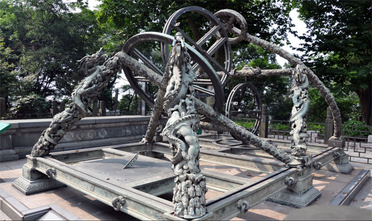 古代天文仪器展示区,这是天文台精华的部分。有外形类似于地球仪的天球仪,又叫浑天仪,上面嵌满星辰,1903年清政府复制;有外形像几个行星运动的圆形轨迹互相嵌套的浑仪和简仪,都是明正统年间铸造的;有靠日影测时间的圭表;还有清政府于20世纪初复制的测坐标的地平经纬仪。