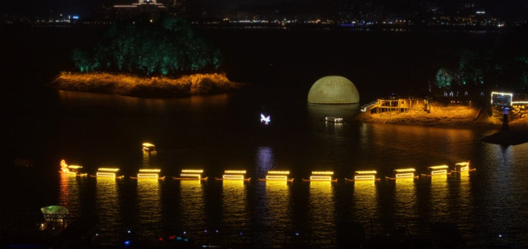 逸园——独岛澄谧,将整体岛屿空间作为一个整体,采用灯光程序控制的方式营造呼吸的生命感,同时结合星空视效以及通过灯光营造的别具千岛湖特色的“金腰带”为游客打造一处不可登临只可远观的视觉景观。