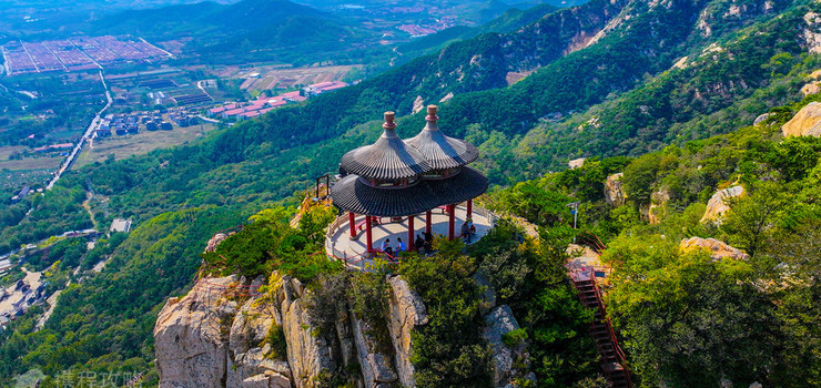 山腰上,有两块突兀的巨大石柱,耸天而起,凌空对峙,蔚为壮观,俗称“双崖石”,也称“双眼石”。晨曦夜月之下同时反光,如同双日生辉,又恰似山的两只明亮的眼睛,故而得名。在双崖石东石的顶端,建有一亭,因双亭连体,故名“双谊亭”,有“万山丛中一点艳”之感。亭下有栈道,曲径可通,是游人登高远眺的好去处。