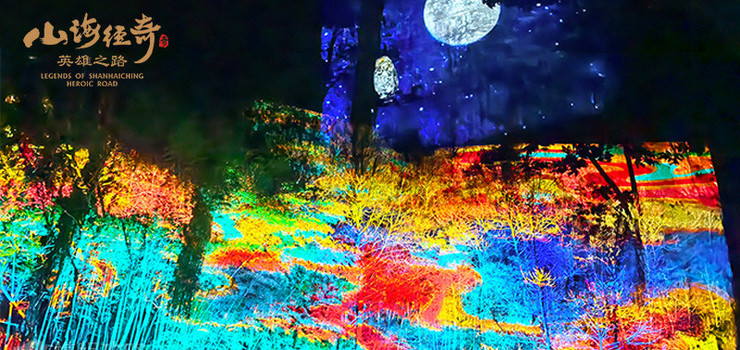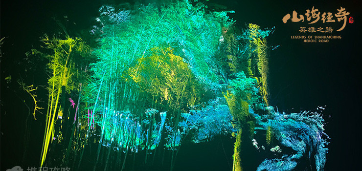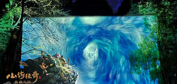 “山海经奇英雄之路”位于浙江省绍兴市新昌县十九峰风景区内,以十九峰特色自然生态景观,以天然崖壁为幕、奇幻幽谷为景,以中国传统文化奇幻典籍《山海经》为原型,主游路线全长约2.6公里,包含 “混沌世界”、“怒触不周山”、“英雄现世”、“化熊抗水”、“青丘九尾”、“山川命名”等主题场景来讲述大禹治水的故事。利用全息投影,3D mapping、体感互动、线上线下游戏交互体验、激光矩阵、艺术装置等多媒体技术,结合雾森、灯光、置景、影像、音乐等声光电元素,打造一场集视觉、听觉、触觉为一体的光影盛宴,为游客提供一个窥察世界全方位的视角,在这个遥远而磅礴的神秘世界里寻觅灵感,感受中国传统文化魅力。