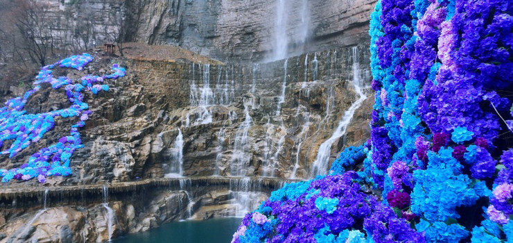 七色俱全的瀑布彩虹,微风吹来,彩虹随风飘移,忽隐忽现,虚无飘渺,如观仙境。登上栈道,慢慢上山:往下看如同天上看人间,袖珍山水,微观景现;往上看千尺绝壁,立于眼前,青松倒挂,盘根错节,胆小的朋友会心惊肉跳,浑身哆嗦。但是不到山顶非好汉,坚持就是胜利。