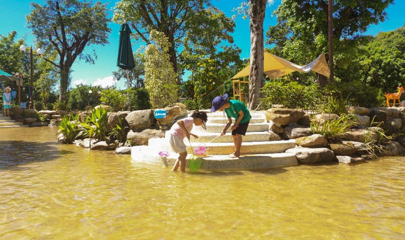 【抓鱼摸虾区】:在小溪中追着鱼儿跑,小朋友能和父母或小伙伴们在森林海体验挽起裤脚、手拿渔网、横跨池塘、抓鱼摸虾的乐趣,如果你非常厉害抓到战利品,还可以把你的专属小鱼带回家。