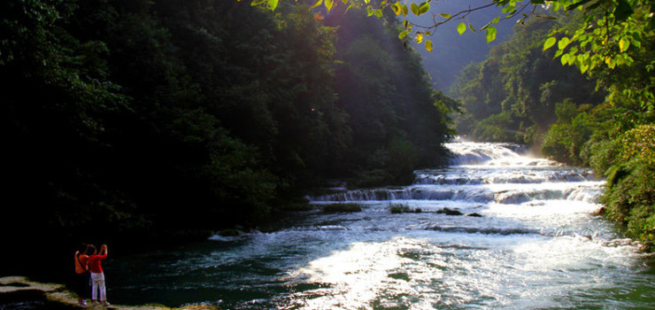 荔波大七孔景区以原始森林、峡谷、伏流、地下湖为主体、尤其是妖风洞、恐怖峡、地峨宫景点,洞中有瀑,瀑下有湖,湖上有窗,阳光投下形如日月星斗,极富惊险性、神秘性、奇特性。高百米、宽数十米跨江而过的天生桥被专家们誉为“大自然神力所塑的东方凯旋门”,观之令人肃然起敬,为大自然巧夺天工之神力报折服。
