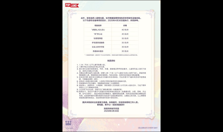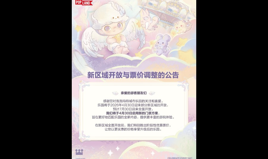 乐园旨在传递快乐,打造城市中的“小美好”“日常中的非日常”,力求给游客提供“环境情绪价值”,让每一次到来,成为一个轻松疗愈、收获美好的过程。乐园将始终秉承着泡泡玛特“创造潮流,传递美好”的品牌宗旨,为全龄段广大消费者带来全新的城市休闲娱乐轻体验。