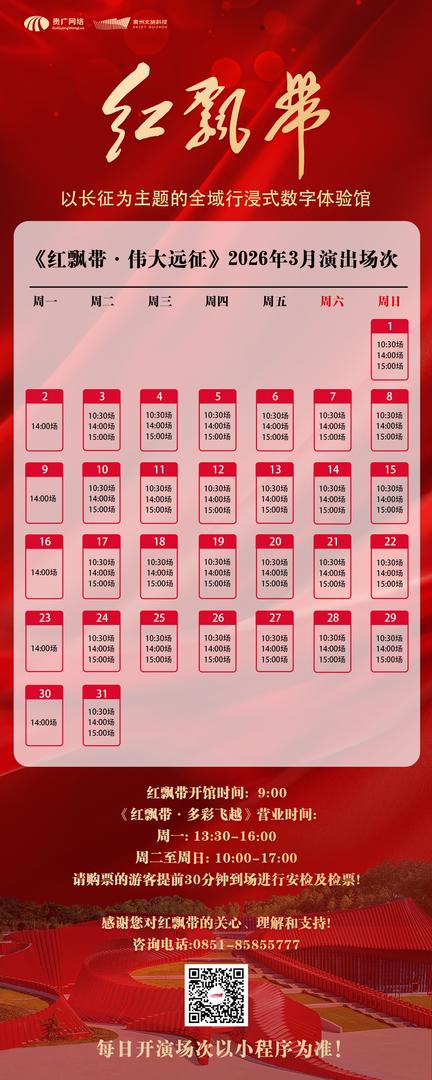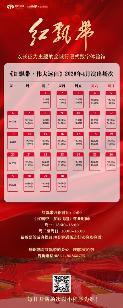 五、《红飘带·伟大远征》观演时长约90分钟,《红飘带·多彩飞越》观影时长约10分钟(不含排队时间),中途均不可离场,请合理规划时间安排。