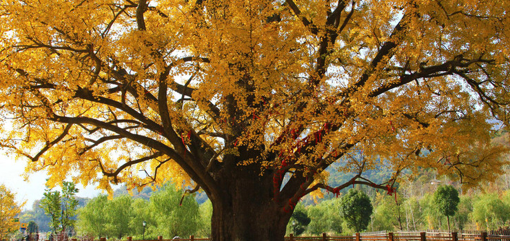 此树可谓根深须广,枝繁叶茂,春夏时节,叶片翠绿,绿荫葱茏;金秋时节,叶片金黄,鲜艳夺目,与四周层林尽染的远山近峦相互辉映,耸立在色彩斑澜的世界里,极为壮观。