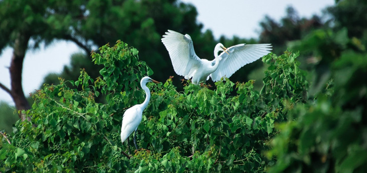600余个墩岛散布湖面,1000余条港汊纵横交错,还有800多种动植物在这此繁衍生息,其中就有被誉为植物中的“大熊猫”的野生大豆、有被誉为动物中的“大熊猫”的朱鹮。常见的鸟类有朱鹮、白鹭、野鸭、水鸡、水雉、小(piti)等。