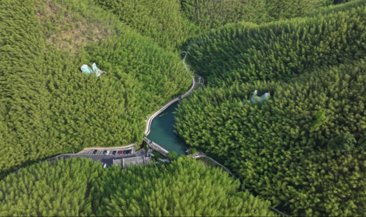 在葱葱郁郁的竹海里,还隐藏着一汪碧绿的小潭——秀女湖,竹子与翡翠色的潭水相映,非常漂亮。