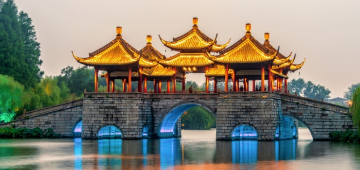 五亭桥是瘦西湖的标志,至今有两百多年历史。桥上建有五座风亭,每到满月之夜,五亭桥下十五个桥洞中每个洞都含着一个月亮,泛舟穿插洞间,别具情趣。