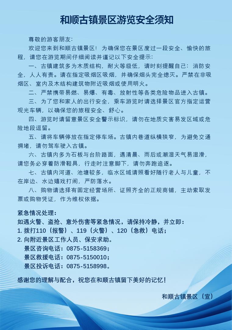 欢迎您来到和顺古镇景区!为确保您在景区度过一段安全、愉快的旅程,请您在游览期间仔细阅读并谨记以下安全提示: