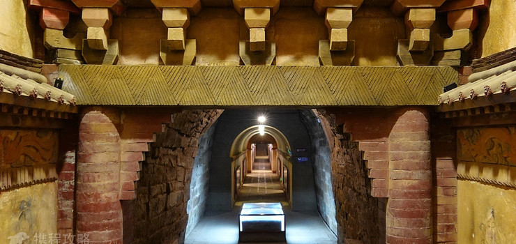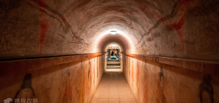 墓道以大殿东阙台下的券室做为入口,其可分为南北两段,南段为平行隧道,北段为坡道、由南向北呈下降之势,两侧墙上画有大量壁画,尤以青龙、白虎之形极为传神,使人如入仙境之感。在墓道两侧墙内设有10个耳室,陈列着丰富的陶俑,这些陶俑或嫣然而笑,或敛目凝神,或威武森然,或故作滑稽之相,不论从人物面目表情、帽饰、发型、项、背、腰肢到臀部,都制做的非常精美准确,不但艳丽多姿,而且富于时代气息。它们多种多样的发型、服饰、所携器物,反映了当时人们过着丰富多彩的文化生活,而这丰富多彩的文化生活,又是我国古代各族文化交流融合,共同推进中华民族文化发展的证据,是时代的特定产物。