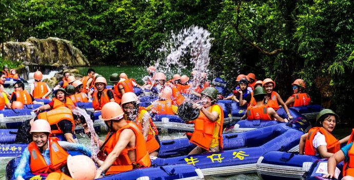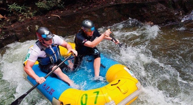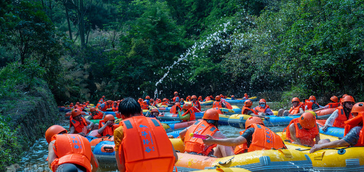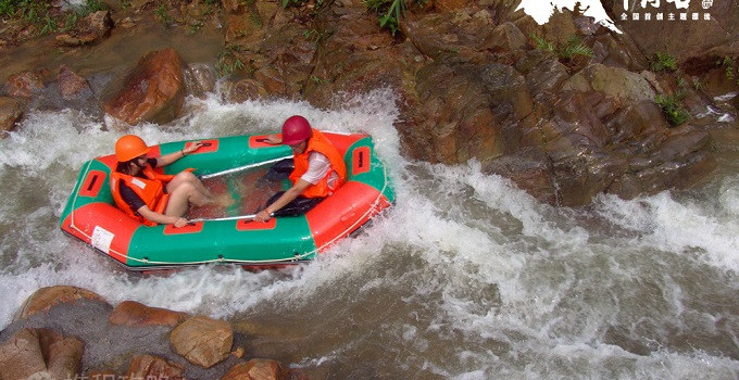g.遇有落差和险滩时,请听从河道工的安排:抓紧漂流艇旁的拉手,收紧双脚,身体向漂流艇中央倾斜