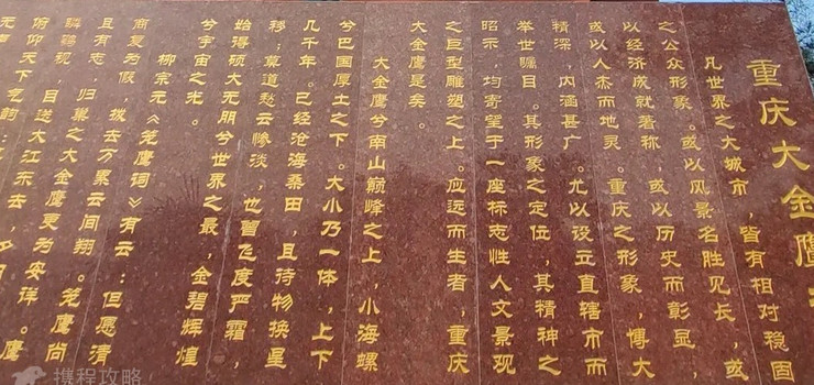 大金鹰海拔682米,水泥浇铸,外敷金箔,内设通道,游客可直登鹰的头部,上设有观景台,凭栏远眺,重庆数十里景物尽收眼底。是主城风貌白天观赏点,是《鸟瞰新重庆》的一个景点,目前已成为重庆市的标志性建筑之一。园内草绿树荫,常年云蒸霞蔚,四周苍松簇拥,诗情画意浓郁。